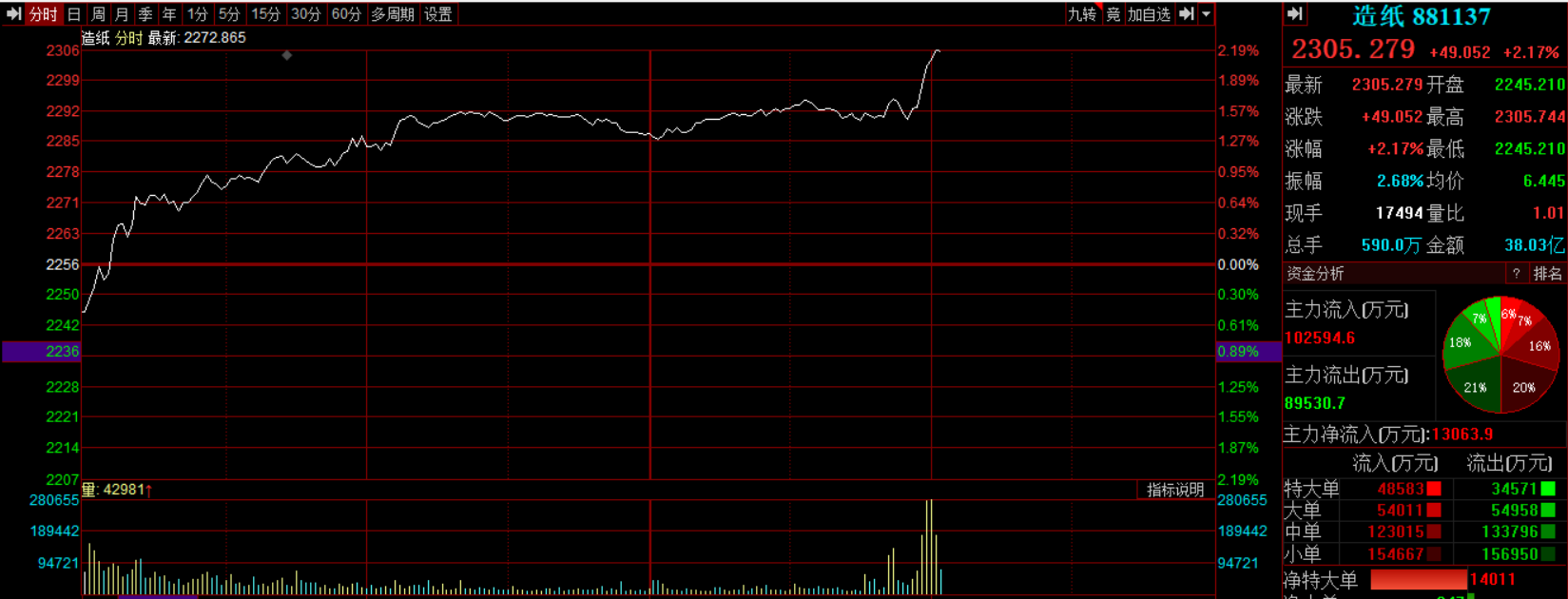 14:01 造纸板块短线拉升,景兴纸业涨停,荣晟环保、民士达、岳阳林纸、博汇纸业、民丰特纸跟涨。